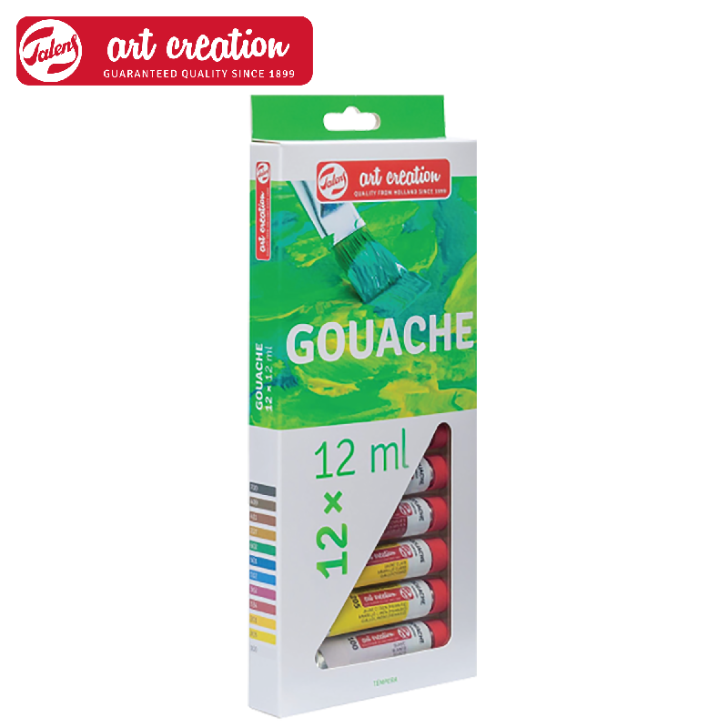 เนื้อสีทึบ สามารถผสมน้ำได้ สีแห้งไว เมื่อระบายเเล้วจะไม่ทิ้งรอยแปรงไว้ ขนาด 12 ml. จำนวน 12 สี